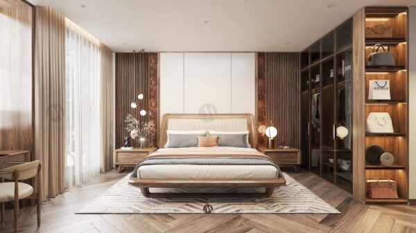 Phong cách tối giản (Minimalist): Giảm thiểu chi tiết rườm rà, tập trung vào bề mặt gỗ mịn và vân gỗ tự nhiên để tạo sự thư thái và gọn gàng.