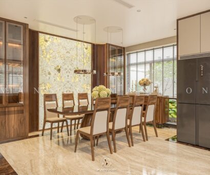 Bàn ghế ăn gỗ óc chó phối đá hoặc kính cao cấp: kết hợp vật liệu hiện đại, tạo điểm nhấn sang trọng, phù hợp phong cách nội thất hiện đại – luxury.