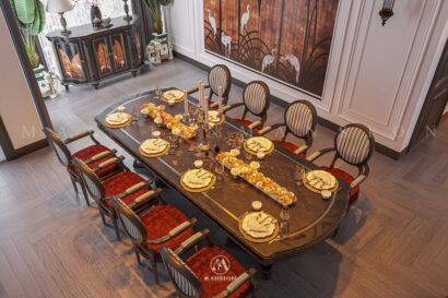 Bàn ăn gỗ óc chó 10 ghế sang trọng: thường đi kèm với thiết kế bo cong mềm mại hoặc chân bàn kim loại mạ vàng, phù hợp những phòng ăn rộng lớn.