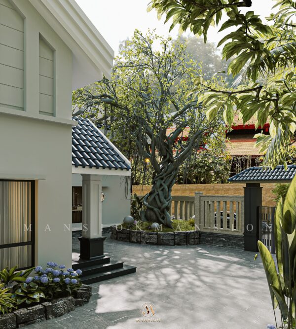Với diện tích 300m2, biệt thự đơn lập được bố trí thoáng đãng, đề cao trải nghiệm gần gũi thiên nhiên. Khoảng sân rộng rợp bóng cây cổ thụ, lối dạo lát đá và khu vườn xanh mát mang đến cảm giác thư giãn ngay khi bước vào cổng.