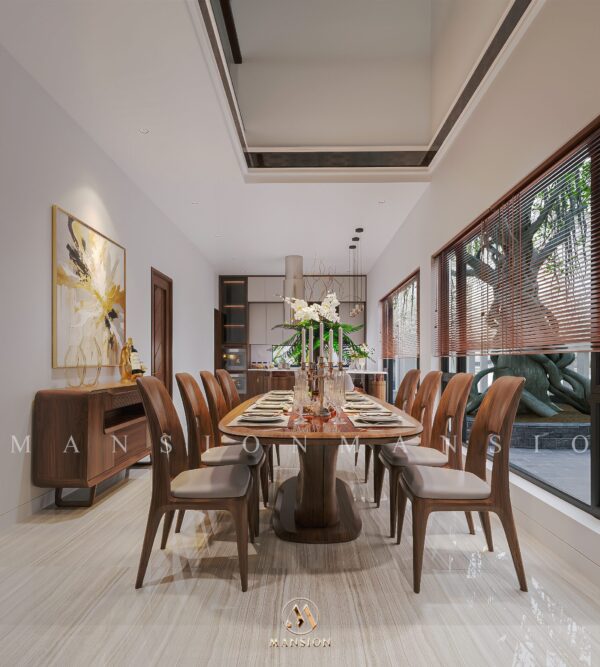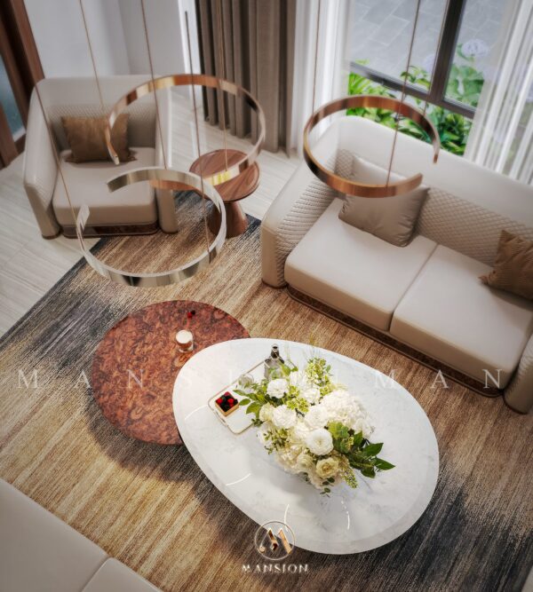Không gian bên trong Garden House được chăm chút theo phong cách mộc mạc tinh tế. Các mảng tường sáng, cửa kính lớn cùng vật liệu tự nhiên như gỗ, đá giúp tăng sự kết nối giữa nội thất và cảnh quan bên ngoài. Mỗi góc nhỏ đều hướng đến giá trị sống chậm, sống chất – điều mà Nội thất Mansion luôn theo đuổi trong hành trình làm nghề.