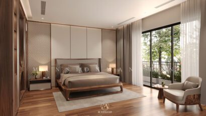 Phòng ngủ sang trọng với gam màu nâu trầm ấm, mang lại cảm giác ấm cúng, tinh tế và đậm chất thượng lưu