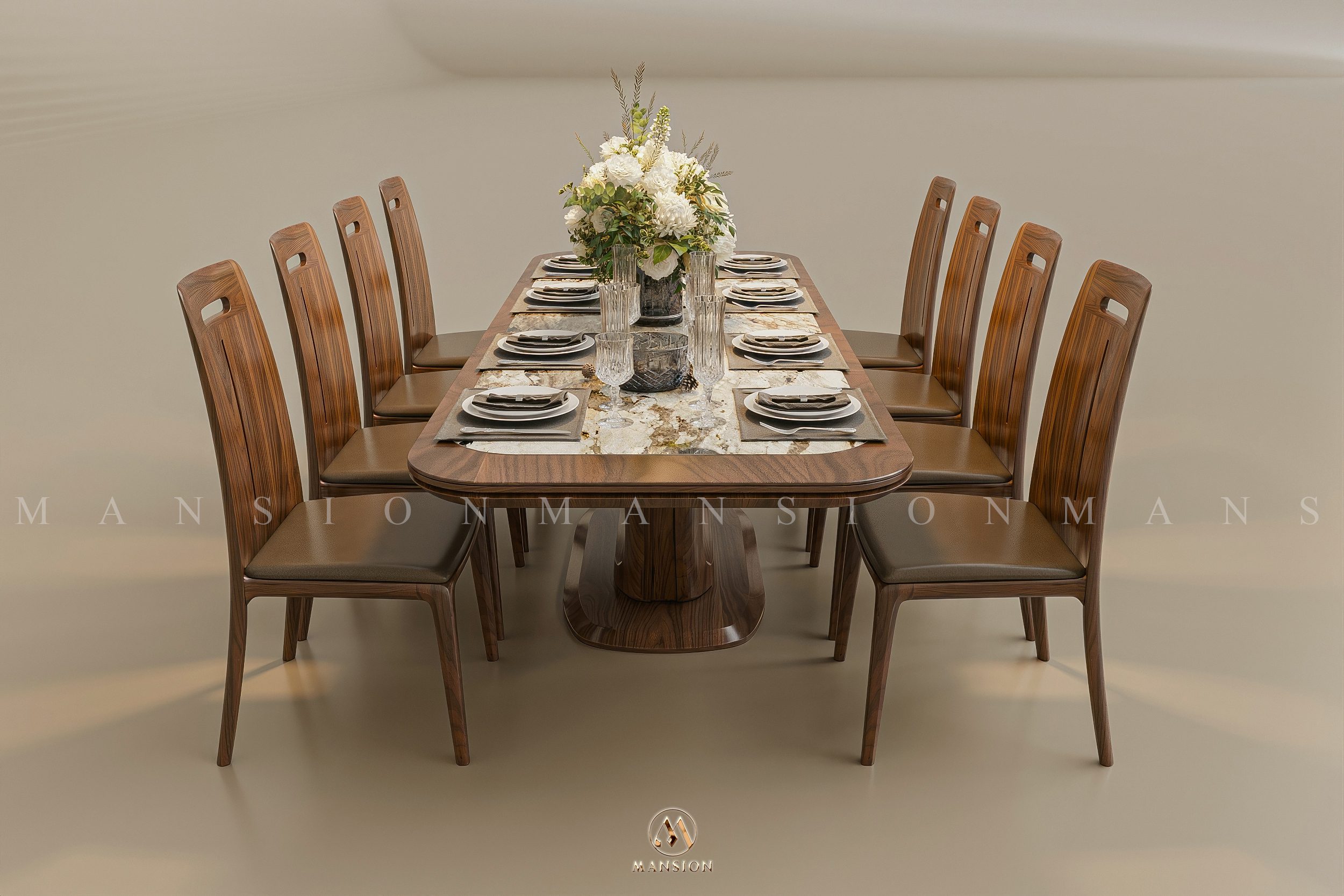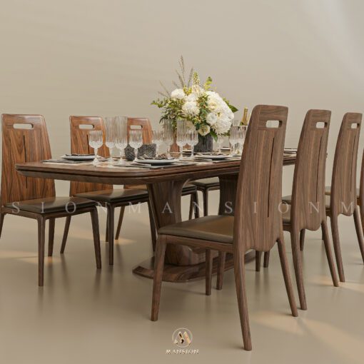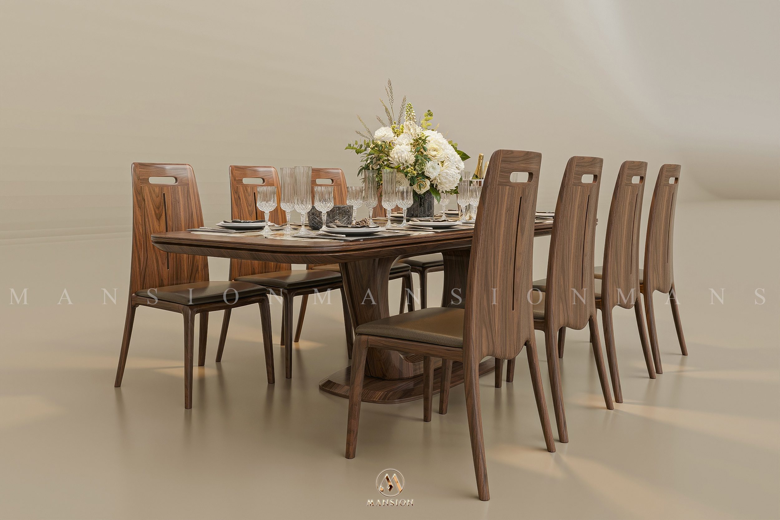 Bàn ghế ăn gỗ óc chó BGA-M026 không còn là những mẫu bàn tròn hay cong như những thiết kế trước của Mansion mà là một sự đổi mới với với bàn nguyên khối cùng chân được thiết kế cong cũng là những điểm nhấn trong thiết kế kết hợp cùng những chiếc ghế ăn được bọc da tinh tế đem đến cho gia chủ một không gian phòng ăn đầy ấm cúng mà không kém phần hiện đại sang trọng.