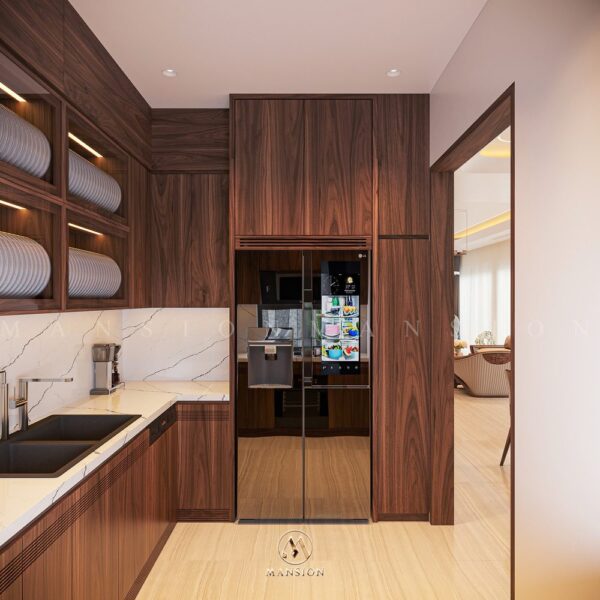 Sự kết hợp giữa gỗ óc chó tự nhiên và gỗ công nghiệp cao cấp không chỉ tạo nên sự hài hòa về màu sắc mà còn tăng tính thẩm mỹ và độ bền cho tủ bếp. Hệ thống thiết bị tiện nghi như bếp từ, lò nướng, máy hút mùi và các phụ kiện thông minh được bố trí hợp lý, mang lại sự tiện lợi tối đa trong quá trình sử dụng. Tủ bếp này không chỉ là nơi nấu nướng mà còn là điểm nhấn sang trọng, tinh tế trong căn bếp của bạn.