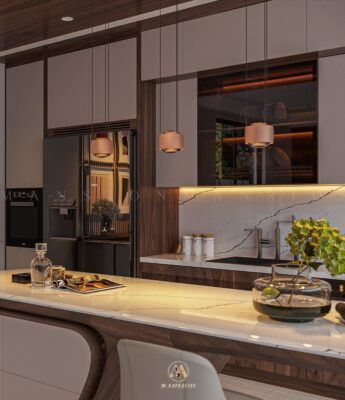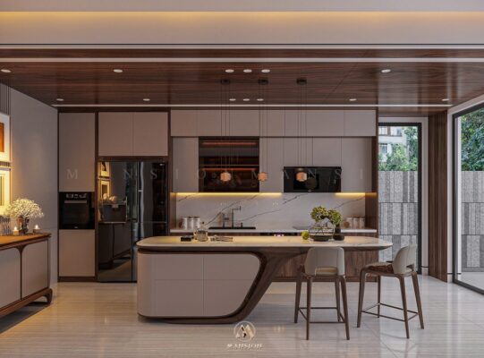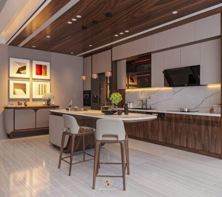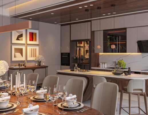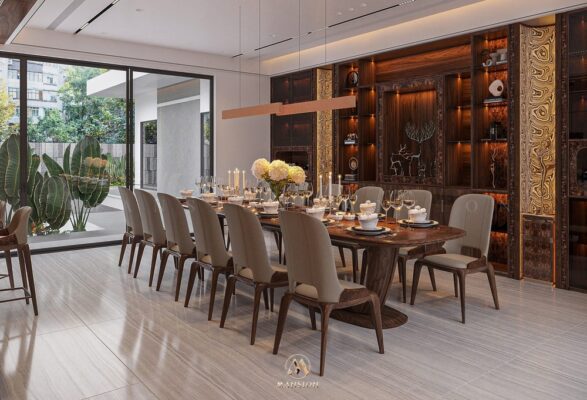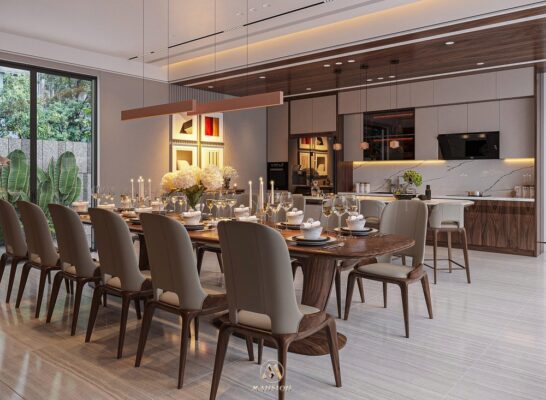 Khu vực bếp và phòng ăn được thiết kế mở, tạo sự liên kết giữa các không gian sống. Hệ tủ bếp bằng gỗ óc chó kết hợp với mặt đá tự nhiên mang đến vẻ đẹp vừa sang trọng vừa bền vững. Bàn ăn dài, ghế bọc da cao cấp cùng đèn bàn ăn đơn gairn, tinh tế giúp mỗi bữa ăn trở thành một trải nghiệm đáng nhớ.