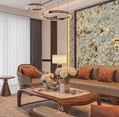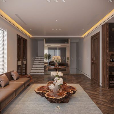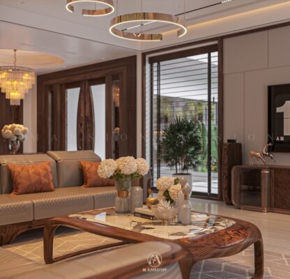 Phòng khách của biệt thự được thiết kế rộng rãi với cửa kính lớn, giúp tận dụng tối đa ánh sáng tự nhiên và mở ra tầm nhìn ngoạn mục. Nội thất sử dụng các vật liệu cao cấp với gỗ óc chó là chủ thể chính giữa bản hào ca có sự góp mặt của đá cẩm thạch và kim loại mạ vàng, mang đến vẻ đẹp tinh tế và đẳng cấp. Với thiết kế nội thất biệt thự nghỉ dưỡng, bộ sofa bọc da cao cấp kết hợp với bàn trà thiết kế độc đáo tạo điểm nhấn ấn tượng cho không gian.